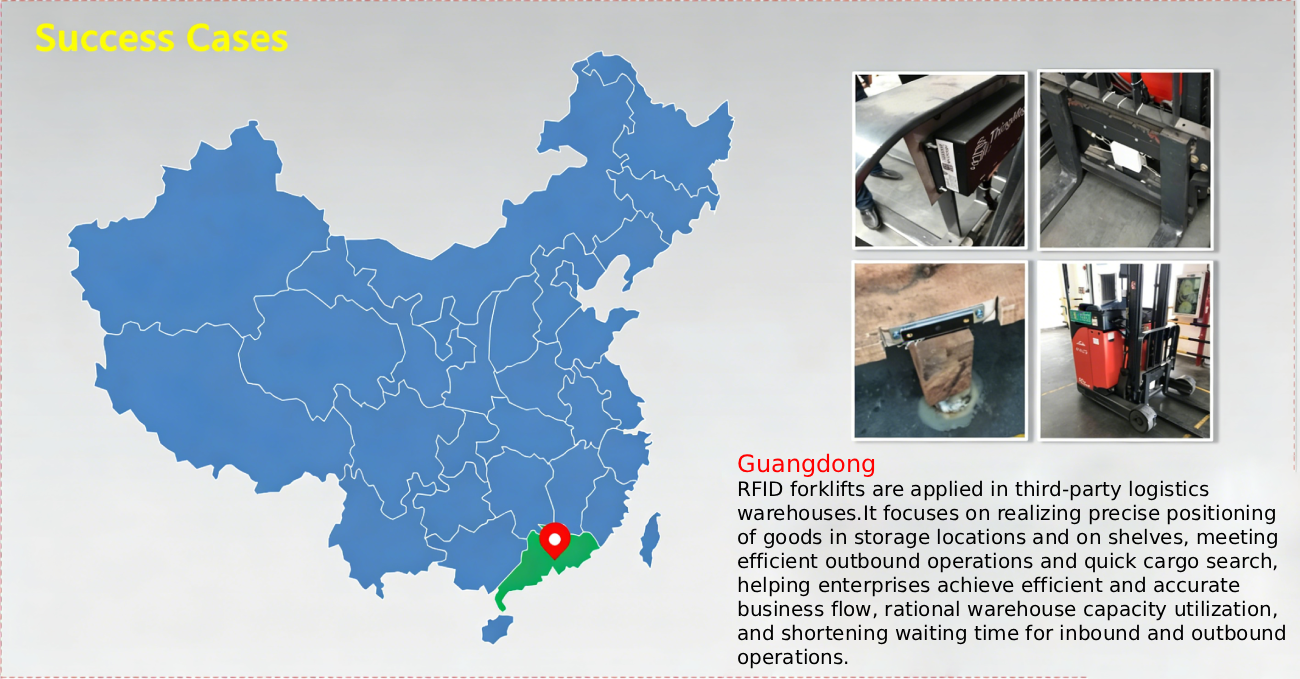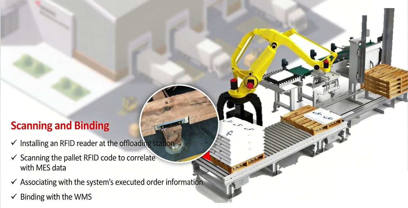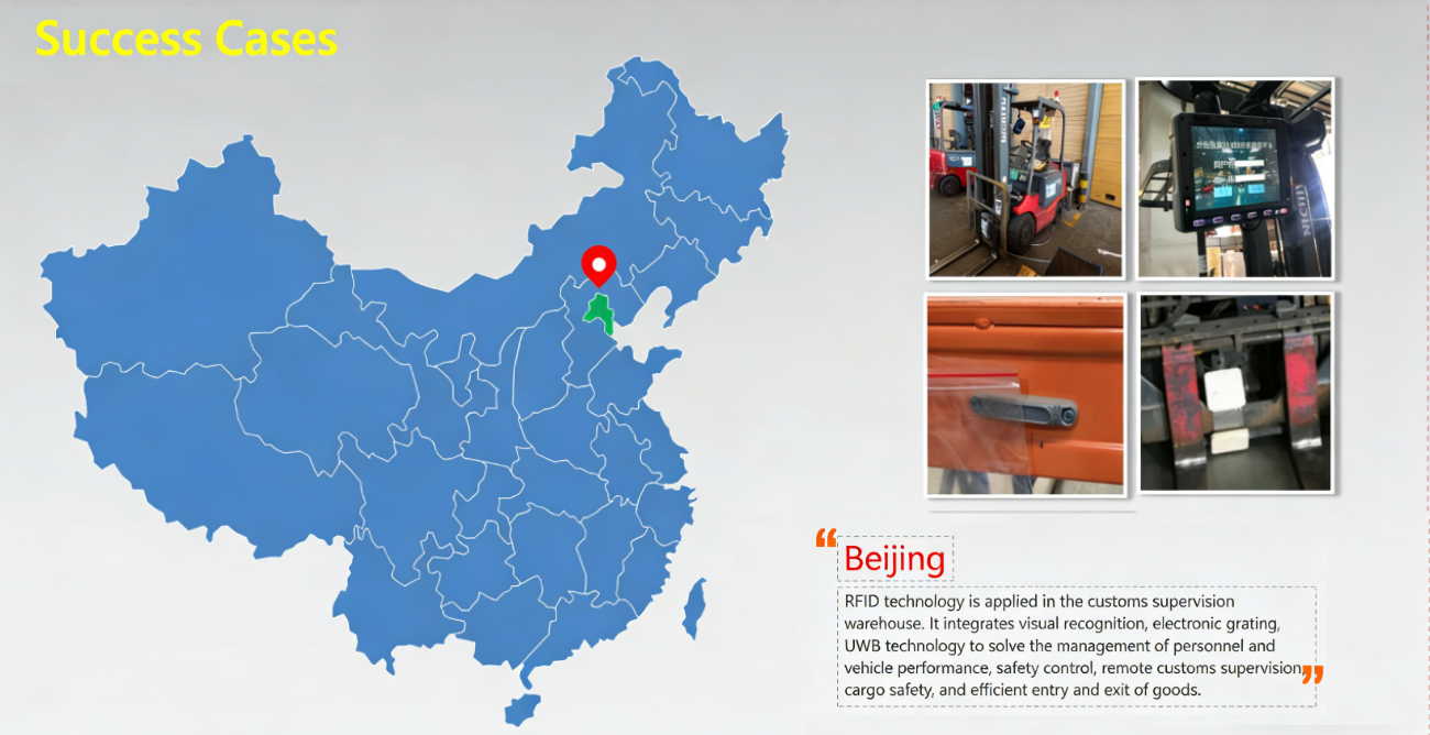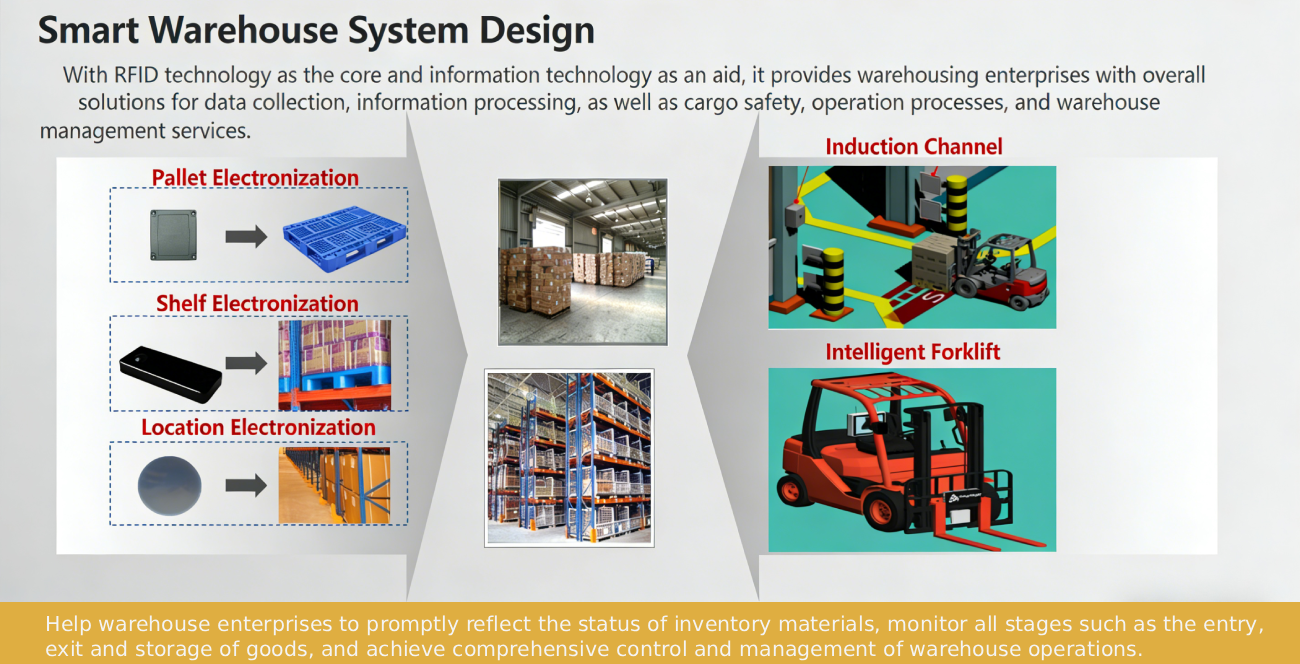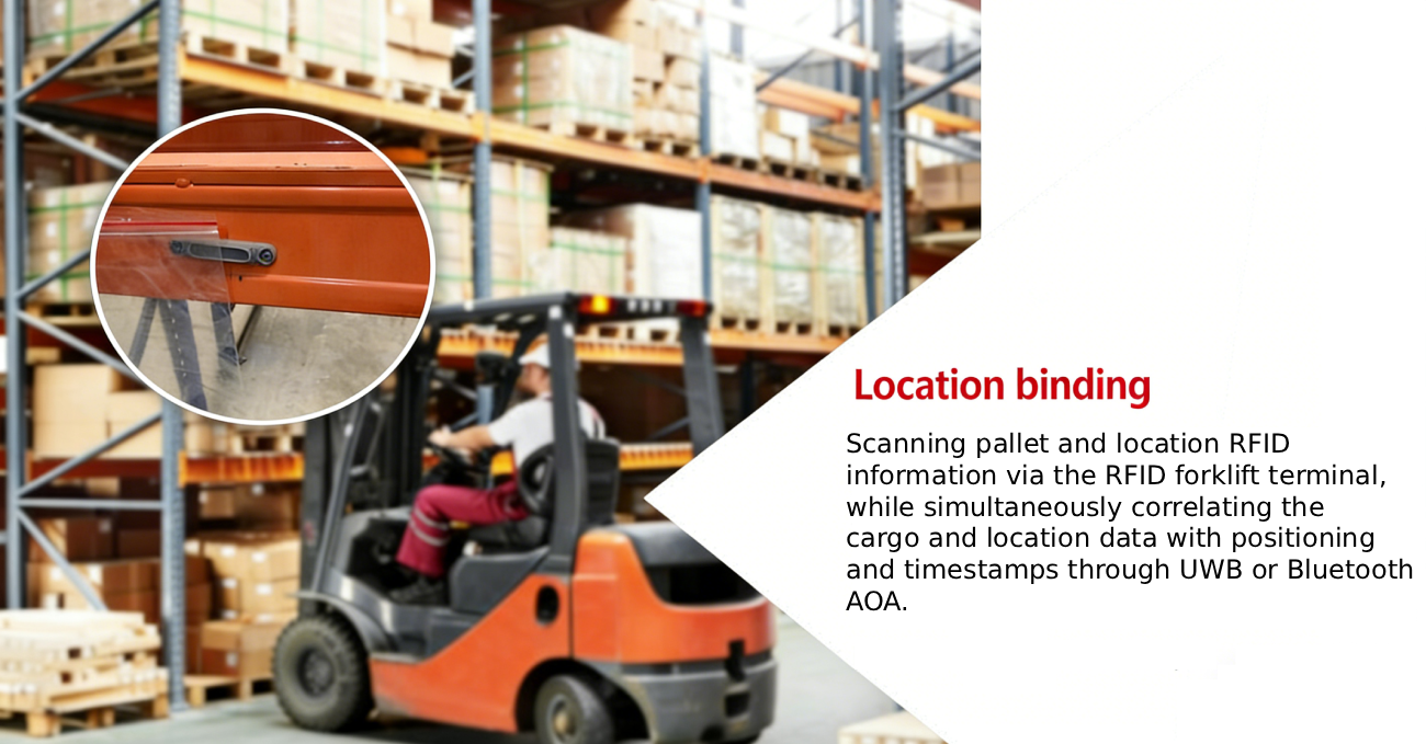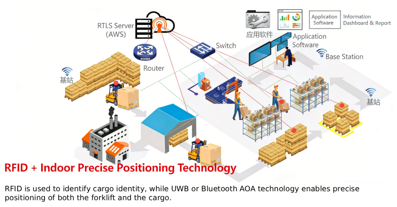 RFID teknolojisi, yük kimliğinin hızlı toplu tanımlanmasını sağlamak için kullanılır; UWB veya Bluetooth AOA teknolojisi ise kişilerin, malzemelerin ve forkliftlerin hassas konumlandırılmasını sağlar.
